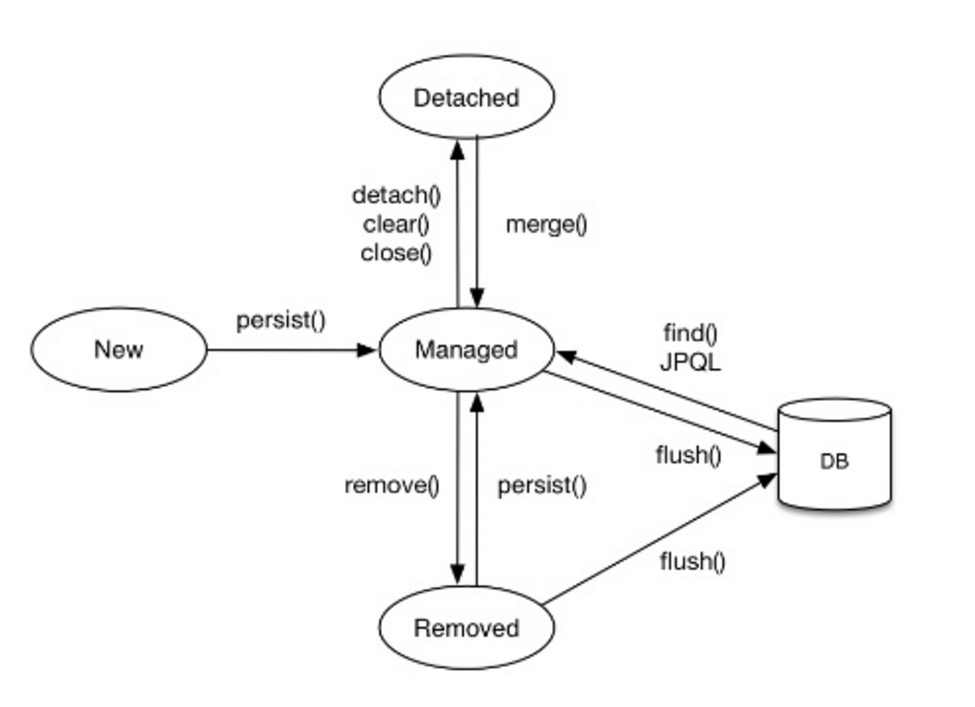 - 영속(managed): 영속성 컨텍스트에 저장된 상태