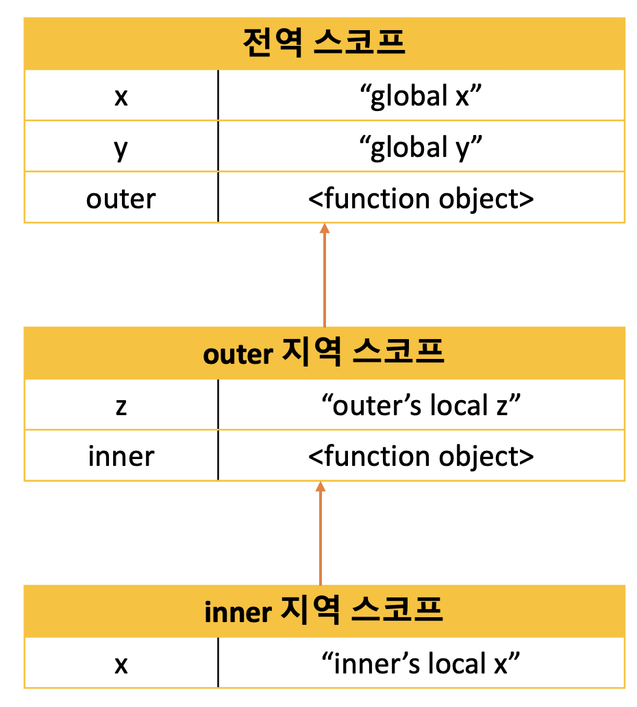 - 스코프가 함수의 중첩에 의해 계층적 구조를 갖는 것