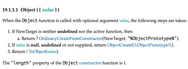 - 리터럴로 생성된 객체가 위의 코드를 보면 Object 생성자 함수와 constructor 프로퍼티로 연결 돼 있다. 이를 확인해 보기위해 ECMAScript 정의한 Objectt 생성자 함수를 살펴보면