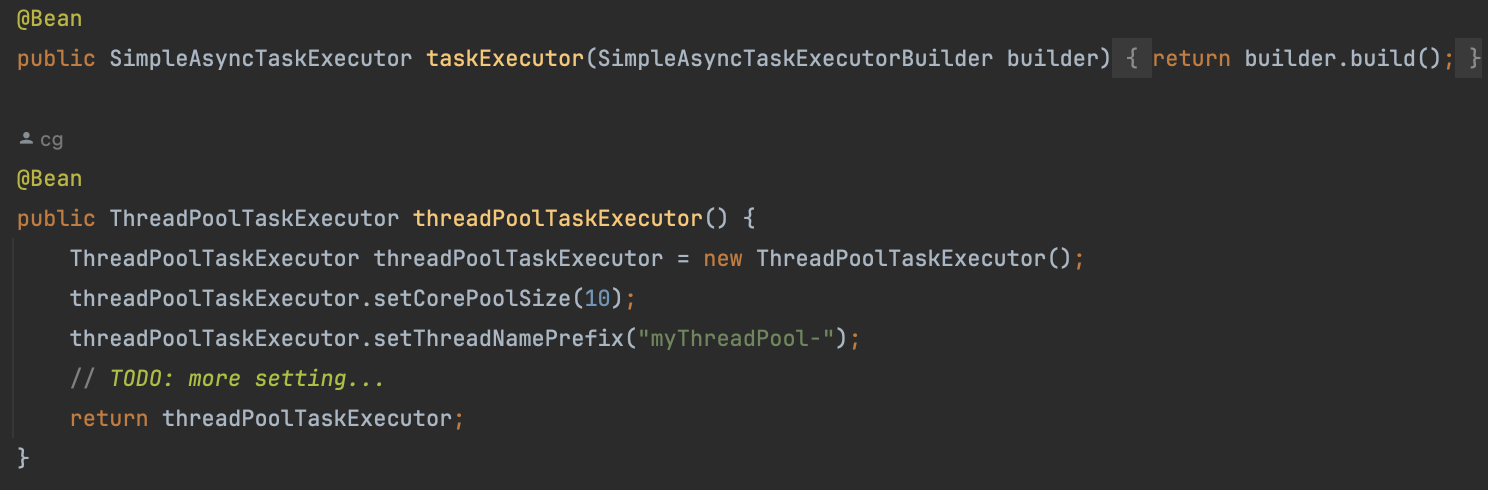 - taskExecutor의 이름의 빈이 존재하면 그것이 default로 사용하게 된다.