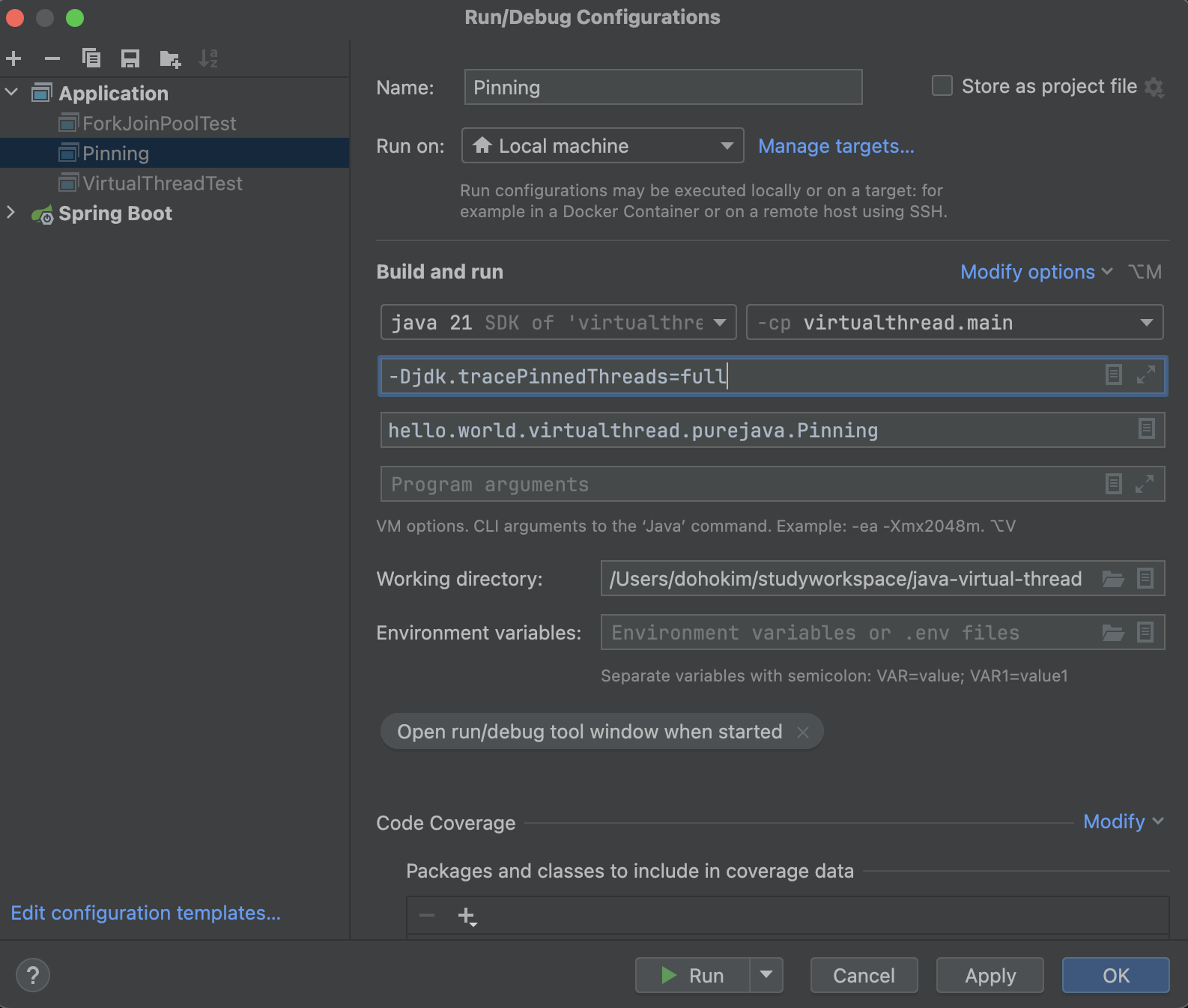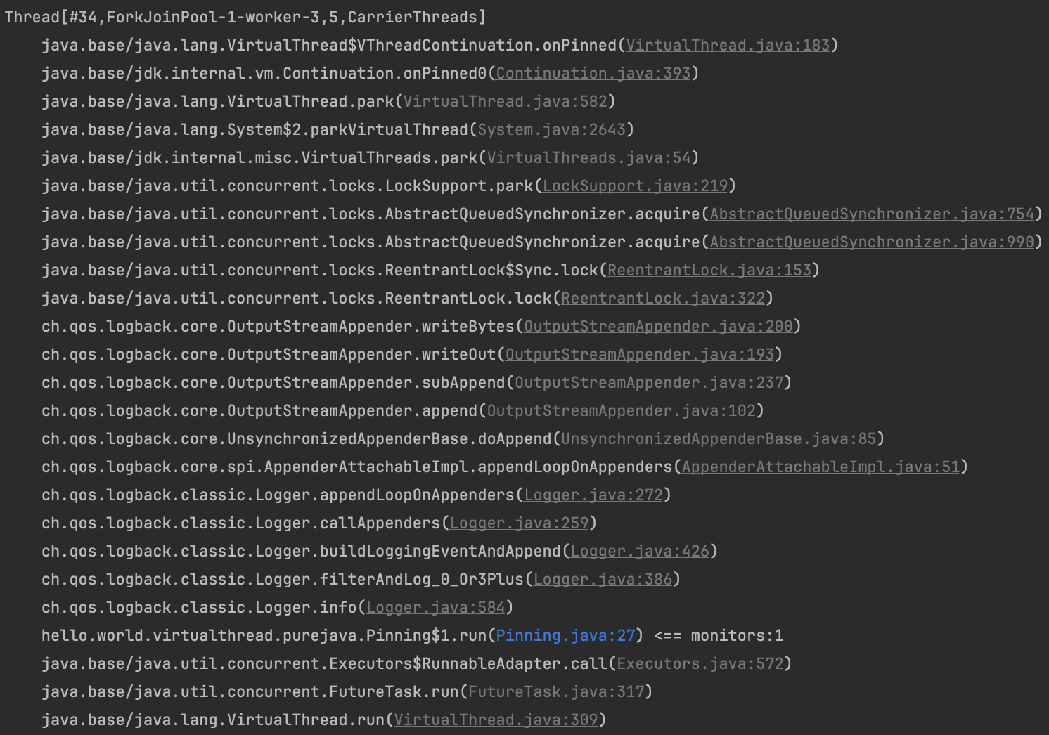 - `-Djdk.tracePinnedThreads=full or -Djdk.tracePinnedThreads=short` 를 이용해서 pinned 되는 부분이 있는지 찾을 수 있다.